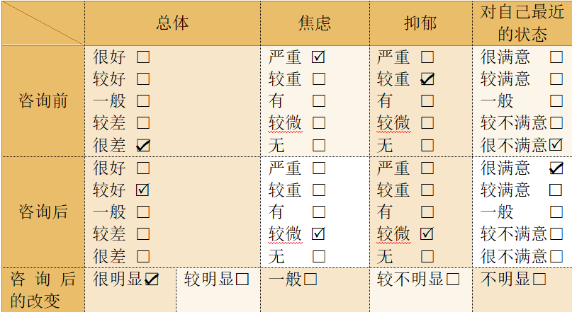 第一次初始会谈之后与学生商讨自杀风险管理工具CAMS并推荐,经学生同意,灵活运用CAMS工具,进行自杀风险的评估与管理。用CAMS工具,使学生清楚地看到自身压力值,绝望程度,激越程度,自我厌恶程度,心理痛苦程度等维度变化,使学生觉察内心真正的需求,有效管控自杀的意念,逐步解除自杀总体风险。