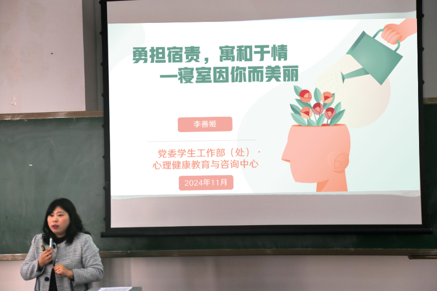 为贯彻落实《全面加强和改进新时代学生心理健康工作专项行动计划》,发挥“校-院-班-寝”四级心理联动机制作用,我校心理健康教育与咨询中心于11月23日、11月25日在延吉校区和珲春校区分别举办了以“勇担宿责,寓和于情—寝室因你而美丽”为主题的寝室长培训活动,旨在提升寝室长的心理素养和专业技能,构建和谐美好的寝室环境。
